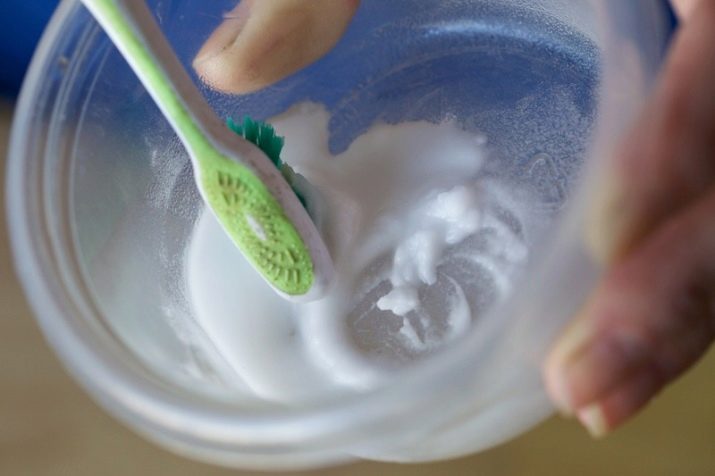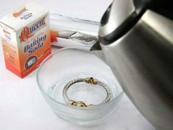 - you need to prepare gloves, a brush, vinegar and soda. In a small container, mix vinegar and soda until gruel is obtained. Then, putting on gloves and taking the product in one hand, the second, lowering the brush into the pulp, we clean our jewelry. After cleaning, rinse objects under running water. This method is suitable for cleaning jewelry that does not contain stones and smooth surfaces, as it can leave the smallest scratches.