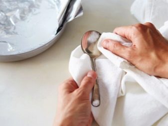 - for 1 liter of water you need to take 2 tablespoons of soda and mix, put this solution on fire. When it boils, you need to put a piece of aluminum foil in it. We put our silverware there and hold it for 15-20 minutes. All this time, gently mix the composition with a wooden spatula or a long skewer so that the silver continuously touches the foil. Then we take out and wash it under running water. Then the products need to be wiped and polished with a soft cloth;