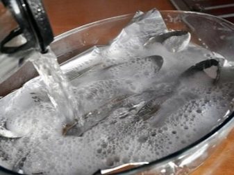 Then we lower our products into this solution. Jewelry should be kept for 15-20 minutes. Cutlery 60 minutes. After exposure to this solution, the products are washed and wiped dry.
