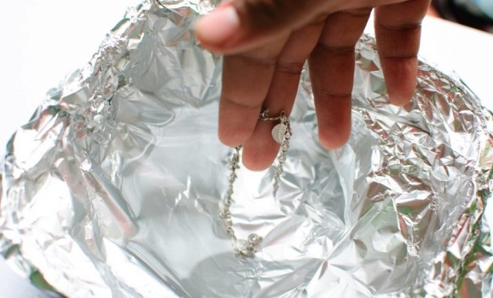 - Take a deep container where jewelry can fit. Line it all with aluminum foil and place all the silver items there. Then sprinkle with baking soda so that it completely covers the silver. Boil the water separately and pour in the boiling water over the decorations filled with soda. Wait until the reaction is over: the soda will hiss and foam. After 10-15 minutes, remove the jewelry and rinse with clean water. Then wipe and polish;