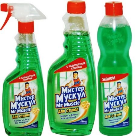 "Mister Muscle" - A fairly effective tool that you just need to apply to the glass surface and wipe with a sponge. Then wash the glass clean with clean water. The tool will wash dirty window sills and frames to a shine.