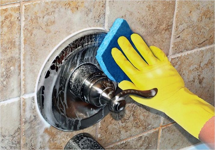 Near drains, taps and sprays, it is necessary to use the most thicker cleaning agent that has the consistency of a paste or cream. Apply a thorough layer of the drug to the problem area, wait as long as it is written in the instructions, and rinse well. This solution will save the surface of the crane not only from calcareous deposits or traces of corrosion, but even from the most stubborn mold. Chrome steel needs to be washed with lemon juice or rubbed with toothpaste, this will help to remove dirt and achieve perfect shine.