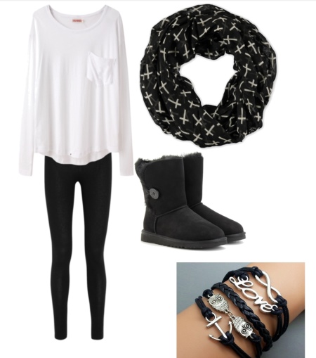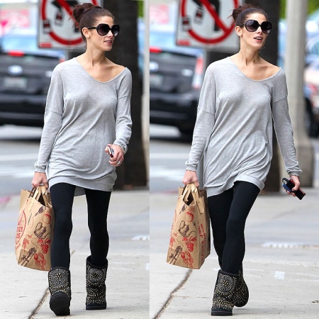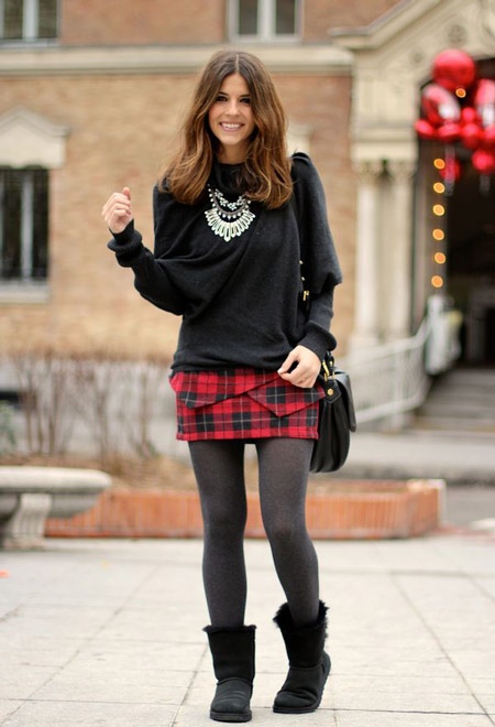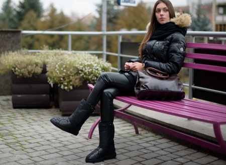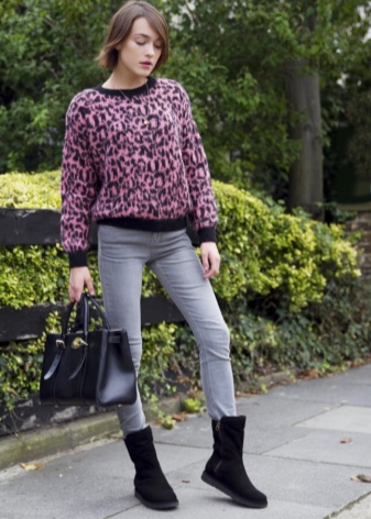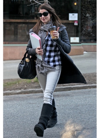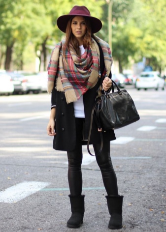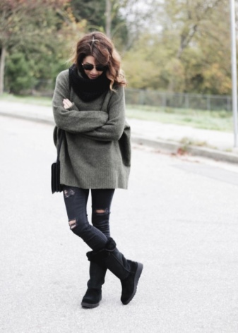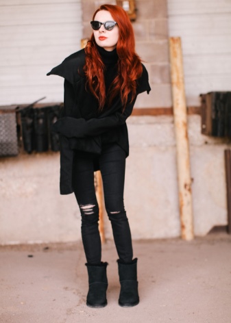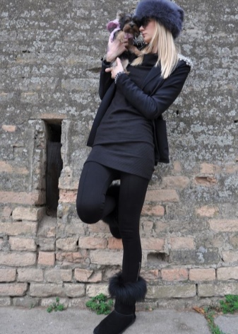 Black ugg boots look great with tight leggings. A thing can be plain or decorated with a variety of patterns and prints. This combination is designed for slim fashionistas. Owners of a full figure from such an ensemble should refuse, since it will draw attention to the shortcomings.
