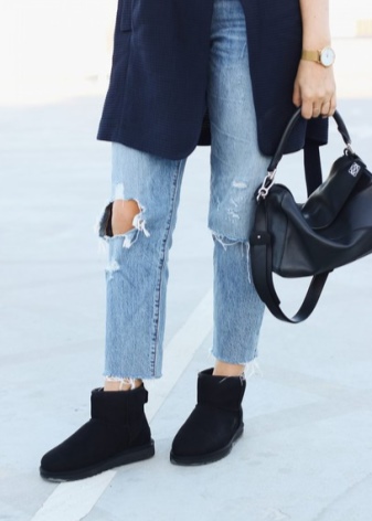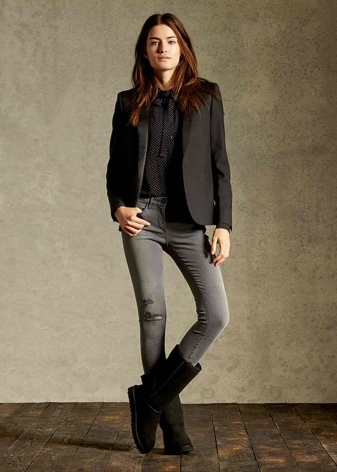 Ugg boots look harmonious with regular jeans. This combination in casual style is one of the most successful. Jeans can be chosen narrower or straight cut. It is recommended to fill them in shoes.