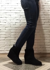 Hidden wedge boots are suitable for wearing with leggings and shorts, sweatpants and skinny jeans. They wear jumpers, knitted sweaters, the main thing is that their shade does not match the color of ugg. Outerwear can include sports jackets, fur coats and sheepskin coats, and a classic-style coat.