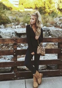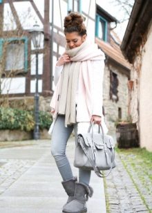 Be careful with accessories, as there are limitations. A small clutch bag or a classic-style bag is definitely not a pair of ugg boots. But a bulk bag or a sports bag will do. Volume scarves or stoles, mittens, and not gloves, are great for uggs. In a word, everything that we associate with this winter.