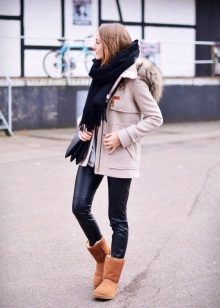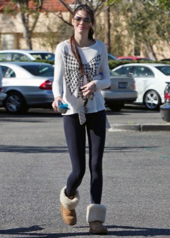 With leggings, ugg boots look great too. Especially if you are the owner of slender long legs. From above you can wear a voluminous knitted sweater dress or a smooth sweater, from under which a shirt sticks out. Stylish.