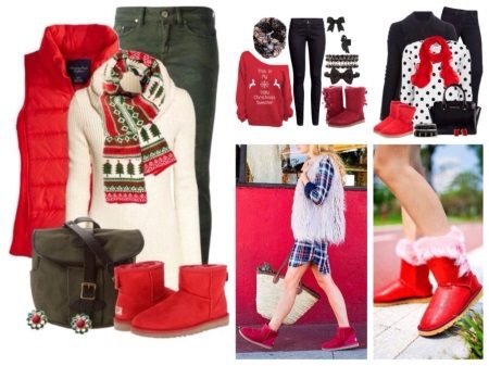 For example, you put on red uggs. They themselves already attract attention, so this is a clear accent in clothes. Therefore, the rest of the clothes should be calm tones - white, black, brown, beige, blue. For example, ugg boots can be combined with something red - a scarf, a handbag, some red element in clothes. Look at the photo. Here are options for clothing with red uggs.