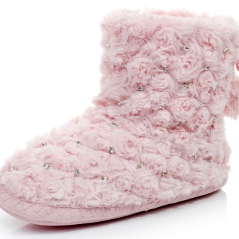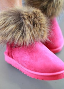 - The decor most often is fur - natural (fox, rabbit) and artificial. The latter is painted in various colors. Pink boots with white fur look gentle enough. Shoes are decorated with rhinestones, satin and leather bows and buttons, which can be a functional detail - to change the width of the shaft.