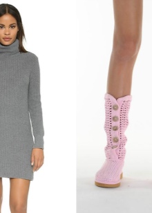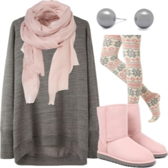 For a romantic date, a combination of light pink ugg and a gray woolen bodycon dress is perfect. Tights should be tight and light. You can use black tights, but then shoes should choose bright, saturated pink colors.