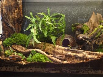 To create coziness, the terrarium can be decorated. So, inside you can add a piece of bark, moss, a few cones and even a coconut shell. In addition, you can plant live plants, for example, fern, young trees, money tree, ivy and other vegetation. Over time, the plants will have to be updated, as the residents of the house will sometimes feed on them.