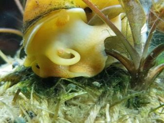 The carapace of the ampoule has a special cap, which is tightened when a hazard occurs or under adverse conditions. These snails have a non-standard structure of the respiratory system. Gills are located on the right side of the mollusk, and lungs are located on the left. To breathe freely, he needs oxygen, and sometimes he rises to the surface to stock up on air through the breathing tube.