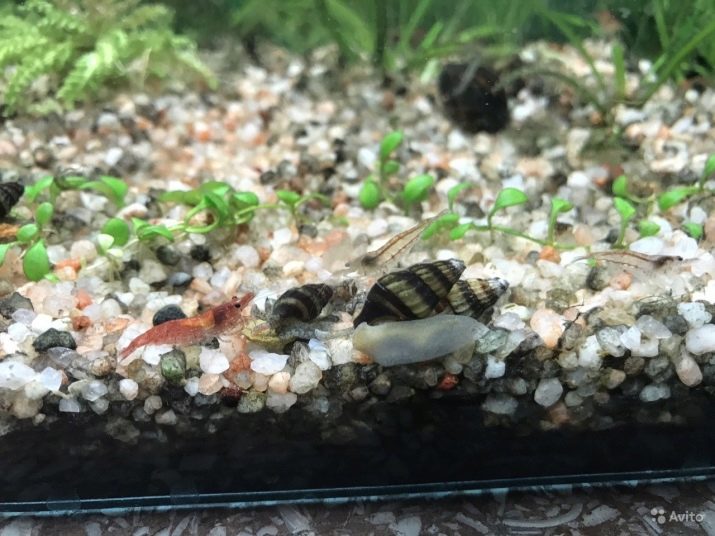 Keep in mind that at a temperature of 20 degrees the snails will no longer be able to give offspring, and at even lower rates, the mollusks will refuse to eat. Use fine gravel or sand as soil. These snails love to bury themselves in the ground to half the shell, so give preference to the smallest fraction. The color can be anything - a creature of such a bright unusual color looks beautiful both on a dark or light background, and at the bottom of a saturated shade.