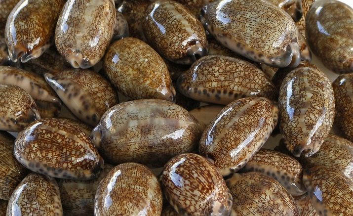 - Kauri (cypreids) or porcelain snailslive in tropical reservoirs, and some species have chosen the Mediterranean Sea. They are distinguished by a variety of colors and special figures of drawings. They feed on seaweed. They live in the clefts of dead coral fragments, burrow into the ground, but on a new moon or full moon they are selected and moved along the rocks. Interestingly, certain species of the family were used in antiquity as money and fragments for decorating funerary masks.