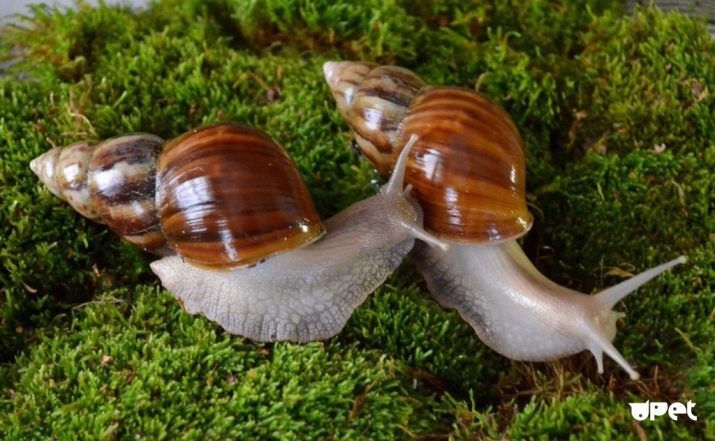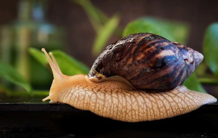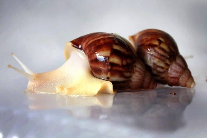 - Achatina - The largest and most popular of domestic snails. They are also called giant African mollusks. There are individuals with a shell longer than 20 cm, the body of the animal can be more than 30 cm. Of course, for such large animals you need to purchase a spacious dwelling, the smallest volume for them is a 10-liter aquarium. Achatins like to swim, so the appropriate capacity for this is simply necessary. The thickness of the filler layer should be 4-6 cm - the mollusks love to dig there. As a rule, their body is painted in grayish-brown color, and the shell has a spiral shape with reddish-brown stripes. Achatina albinos are not uncommon, their patterns look more contrast, the body has milky white shades.