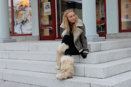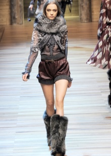 - Such inserts give the shoe an elegant shape, do not allow them to turn into banal boots. High fur boots with a thick sole sewn with a reliable stitch allow you not to be afraid of wet snow. The sole perfectly isolates from the frozen ground. Outside, the bootleg is covered with fur.This is just that part of the leg that, when walking in the cold, should not breathe, but it should be additionally insulated.