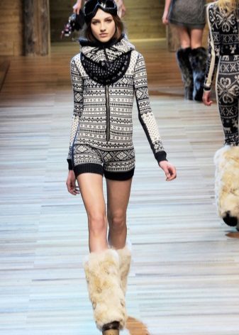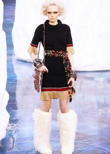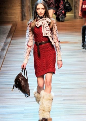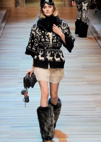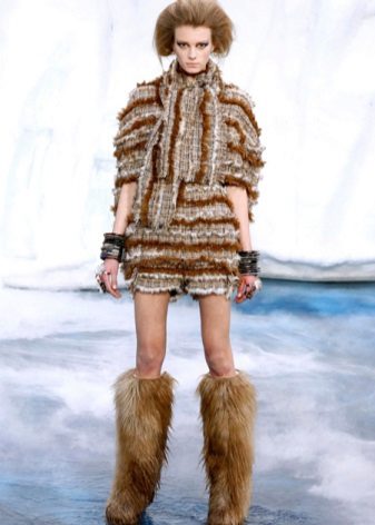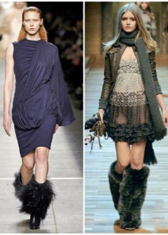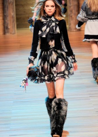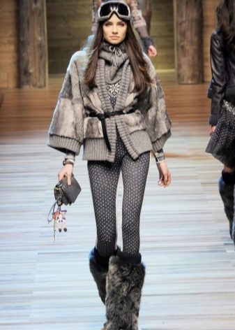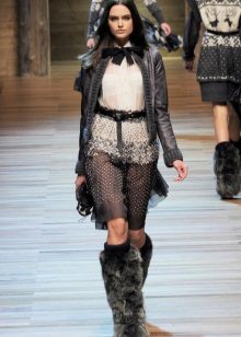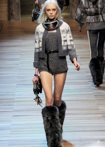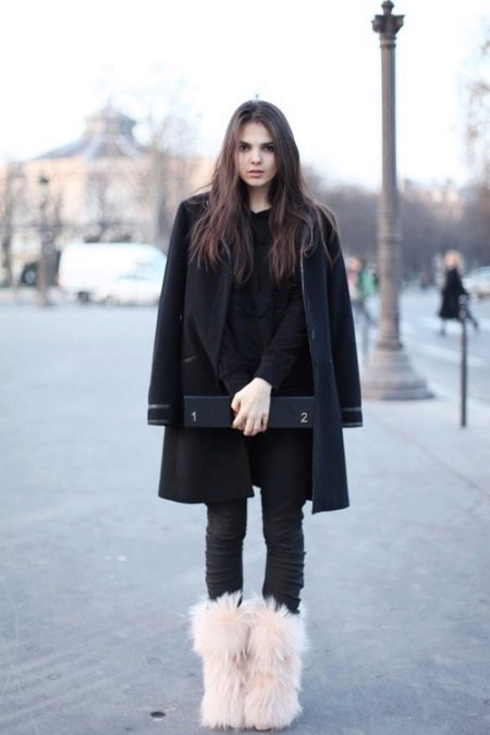 Models of high fur boots with long-haired fur are perfectly combined with short knitted dresses or mini-skirts, this set is complemented by tight tights.