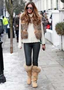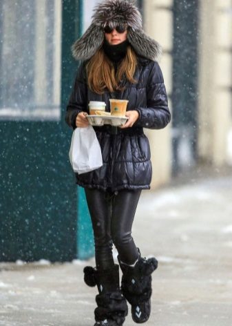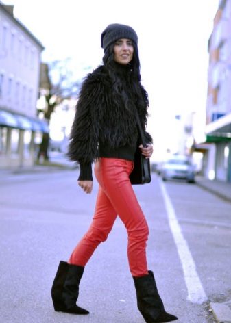 A winning combination is obtained with a fur coat, and it will be great if the color of the fur of clothes and shoes matches. Mongolian short-haired boots go well with a sheepskin coat. It is also permissible to wear these shoes with a jacket or a parka with a fur collar.