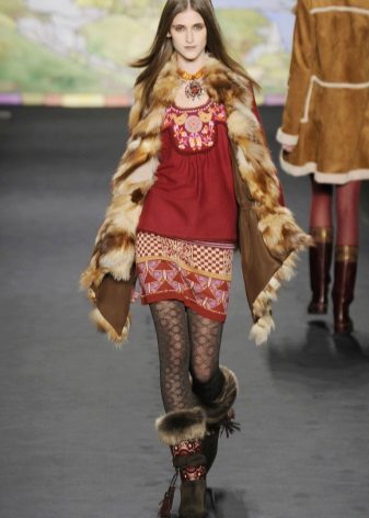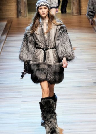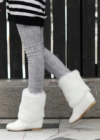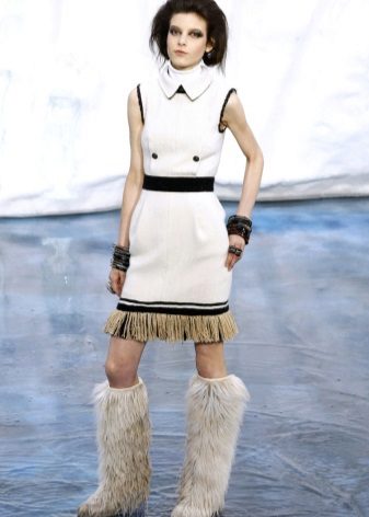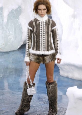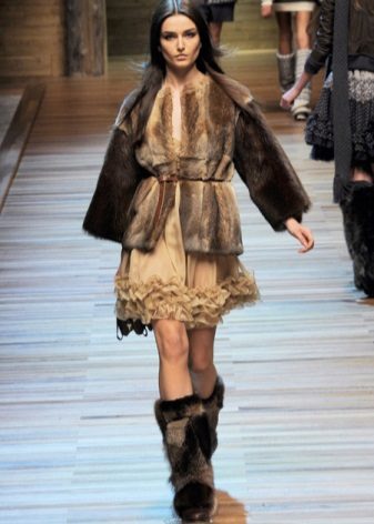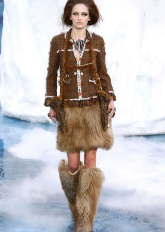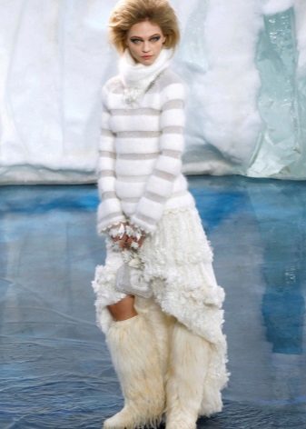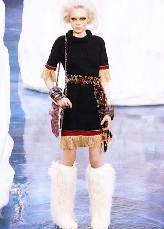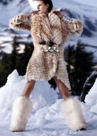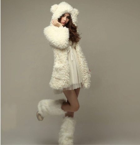 - Touching infantile image in snow-white tones. Glamorous Mongolian high boots look very feminine due to the presence of a heel. Such a tall model with a solid edge fits only under long and slender legs. A short fur coat equipped with a flirty hood with ears serves as a harmonious complement to shoes, and a transparent flared dress looks both innocent and seductive.