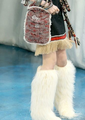Today, the list of materials for sewing these shoes has expanded significantly. For the production of such high fur boots, modern technologies use the fur of dogs of the northern breeds, wolf, arctic fox, fox, as well as wild boar. All these types have high heat saving rates. Also used for sewing leather Mongolian bull, which is highly durable.
