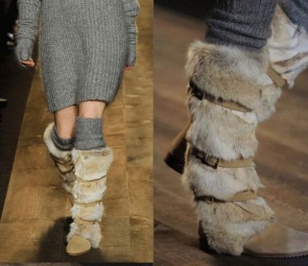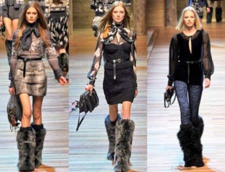 The fantasy of designers does not stop at flat boots. Feminine fashionistas can find original options for heels and wedges. In addition, high fur boots with bowed upward nose look interesting and original.