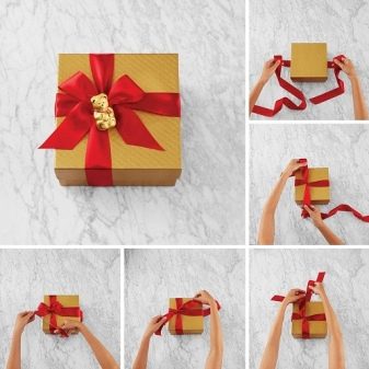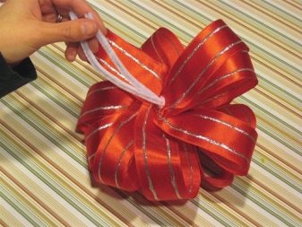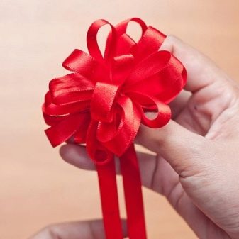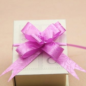 Ready bow is going easy. Manufacturers have provided a specific mechanism that does not require extra effort from the buyer. It is enough to pull on special ribbons, and the ribbon itself will gather in a bow.