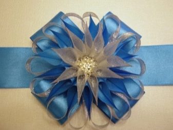 - In the form of a flower. To create an ornament you will need a long ribbon. It should be folded accordion several times. Then a narrow strip of material, the workpiece is pulled together in the center. Next, carefully straighten the loops. You need to do this symmetrically left and right, starting from the inside. The result is a flower.