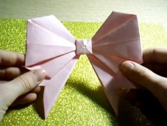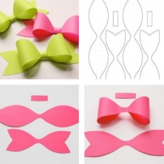 It will take two blanks. One in the shape of a butterfly, where instead of the wings are the tips of the planned bow. The second is like a figure eight, the jumper of which is the site of the nodule. The detail cut out according to the second pattern is glued so that the "ears" of the figure eight are folded into the loops of the bow. Then the resulting element is glued to the one that is cut according to the first pattern. With a narrow paper strip, both parts are seized in the center, forming a false knot.