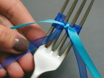 - On the fork. Needlewomen offer miniature bows for knitting small boxes tied with an ordinary table fork. They are convenient to make from narrow satin or rep braid. The length of the segment does not exceed 15 centimeters. The action algorithm is as follows.