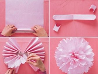 Further, the edges from both ends are cut off in a semicircle or other shape. It all depends on the desire of the master. After this, you need to tie a thread, a narrow ribbon or braid in the middle. Then you should carefully spread the petals, directing them in different directions. It will turn out a very magnificent flower, almost a ball, which is easy to attach to any package.