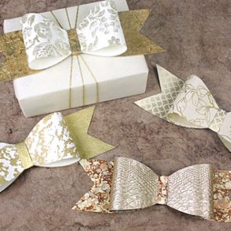 The edges can be perforated, patterned. There are foil options, more brilliant and interesting. The shape of the finished bows can be different: very lush, consisting of a large number of loops, classic, with conical or triangular “ears”, in the form of a flower, in the form of a tie, and so on. The length also varies. If you want to wrap the box, then choose bows with special ends for this. Without tying, the decoration is attached to tape or glue.