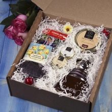 Pay attention to kiwi and banana jam, chocolate covered cherry or cone jam. This gift box option is perfect for women of any age.