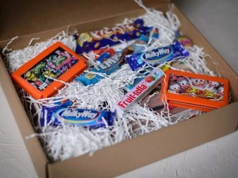 If you give a child or teenager any one gift that will occupy the entire main space in boxing, then various caramels can be used as a filler. The presentation will look very original, and everyone will like such a delicious filler.