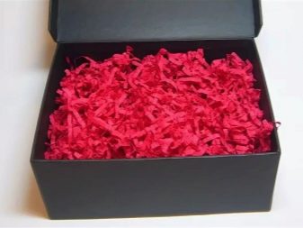 Corrugated shavings or fibers of palm leaves are also great as a filler. This option is suitable for both male and female presentations.In the event that the gift is intended for the New Year's celebration, then you can lay the bottom of the box with tinsel. And for women, you can do something more original. For example, fill the bottom of the box with flower petals.