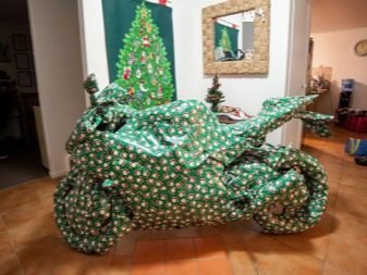 - You can don’t wrap the present at all, but decorate it with a giant bow. Of course, it should be bright - red, raspberry, orange. Most often, paper is not used for this purpose, but specialized synthetic material or fabric is taken. Fasten it through special mounts that do not leave marks on the surface. You can also additionally decorate the gift with balloons with appropriate inscriptions.