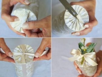 If the tube has a lid, then close it, and similarly pack the top of our gift. Here the circle may be slightly smaller in diameter so that beautiful folds are visible. You can also glue beautiful decor onto the upper part, or get along with a traditional bow and ribbons.