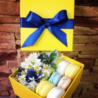 Invariably associated with sunlight, cheerfulness and good mood. That is why it is perfect for presentation design for children. After all, who, if not them, can boast of spontaneity and playfulness. The color itself is very saturated, so we do not recommend mixing it with other shades. But the decor can be selected quite contrasting (purple, green, brown). This will give the gift even more brightness and originality.