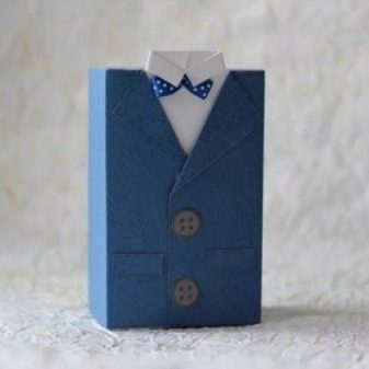 Now let's get on with a jacket. To do this, wrap the shirt with contrasting colored paper. The choice of color depends on your preferences and available options. Bend the edges to the center. They should be a little lapped. Now make the top of the shelf. Bend the edges from the center inward to get a beautiful neckline. Next, bend the edges outward. Our packaging is ready. To give solidity, you can glue a white triangle imitating a handkerchief in your pocket.