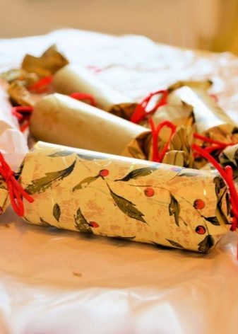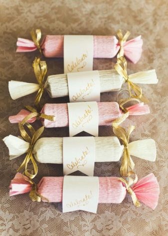 Let's deal with the direct design of candy. We put a gift or a cylinder in the center of the paper, wrap it like a regular candy wrapper. The ends must be twisted, and tie ribbons.