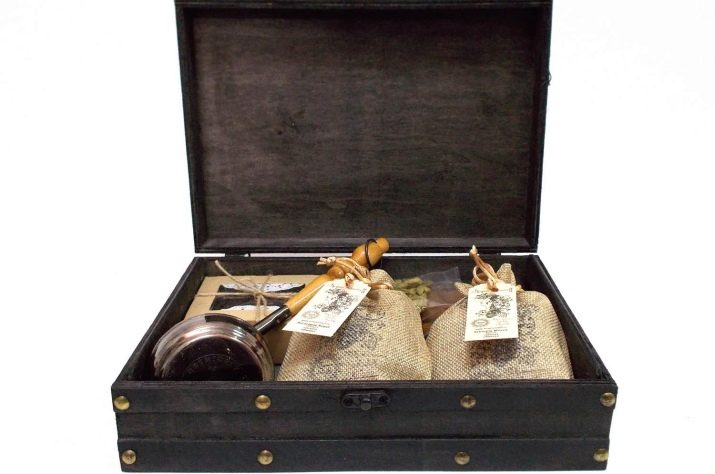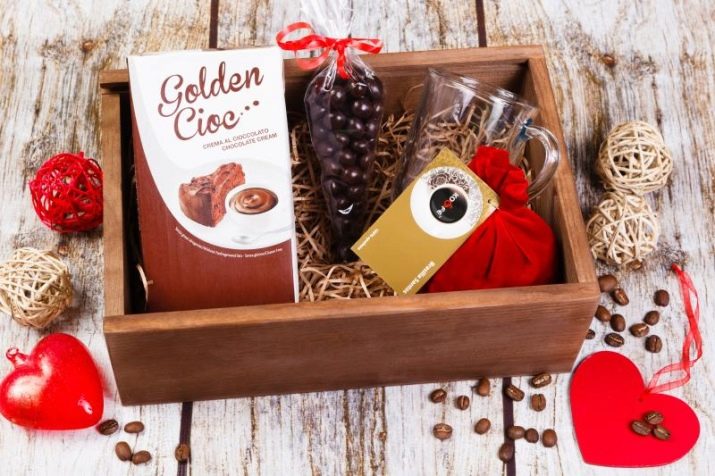 This is a very popular way of presenting a gift today. Boxes like souvenirs look. You need a box, but rather a small box of plywood. But it should be quite roomy in order for a pack of coffee to enter, as well as dessert with a mug. If you give capsules for a coffee machine, it is also beneficial to present them in a gift box.