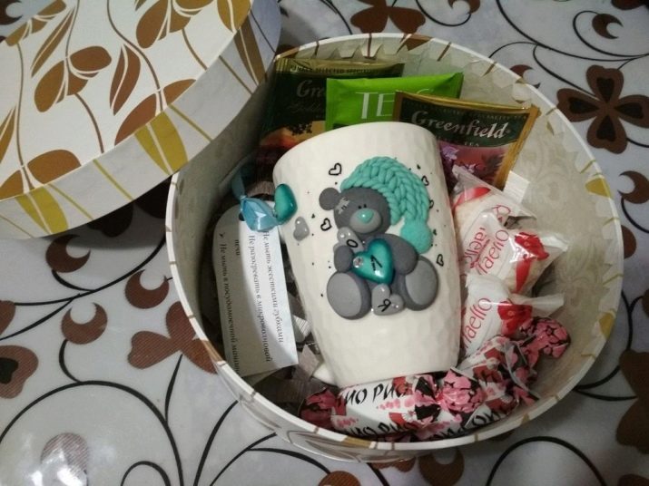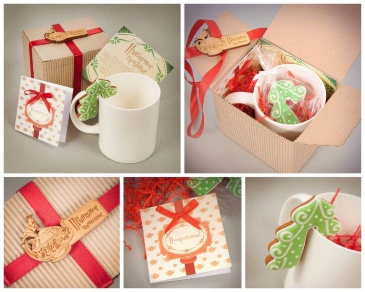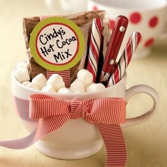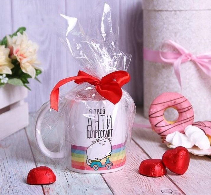 A holiday mug can be given without any external packaging. However, in this case, you need to take care of its internal content. It should be selected based on the personal preferences of the person to whom your present is intended. For example, a sweet tooth will like sweets and chocolates, in the New Year it is appropriate to fill a cup with tea and coffee bags.