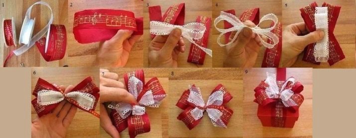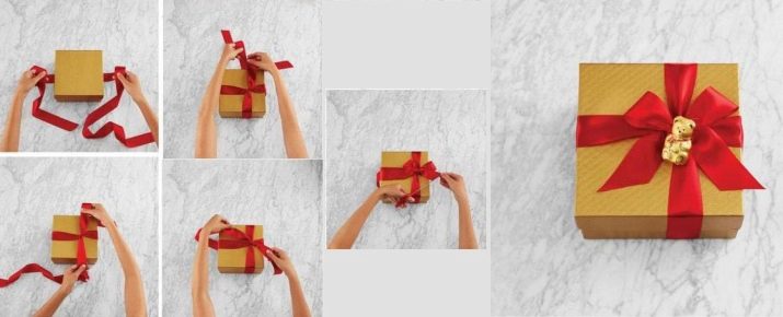 - wrap the gift box with ribbon and mark the location of the bow - it is best to attach it in the middle of the top of the box;