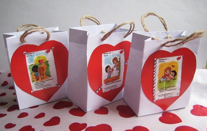- Packing bag. It is enough to buy any paper bag in a neutral color and decorate it based on your desires. The package is easy to make on your own, using cards, magazines, sheet music as a material. If the gift is for a man, form a shirt bag with a bow tie. You can simply add one decor element to the package, which will somehow resonate with the interests of the person being presented.