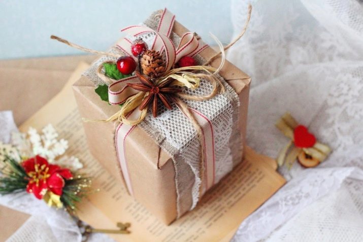 It is interesting to decorate a gift without investing heavily in materials. As a rule, it is simple decorative elements that look most unusual, for example, in eco-style. It is enough to create a package of paper, make a flower from a ribbon or create a composition with a fir branch and cinnamon sticks. You can effectively paste pastes with rhinestones or decorate the package. We offer you some of the easiest ways to decorate a gift, depending on its shape.
