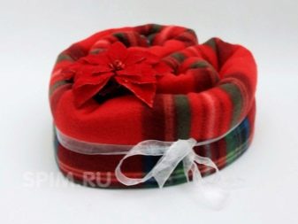 To start, fold the thing in a special way, for example, in the form of a heart. To do this, roll the plaid into a narrow strip along its length (about the way you turn the tube). Then smooth this tube. Then start rolling it from both sides to the center. When both twisted ends converge in the middle, form a heart. Secure with silver tape.