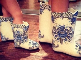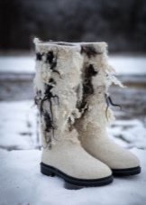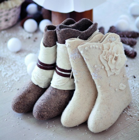 Modern designers offer children's and female models with a variety of decor, which makes it easy to choose a model for every taste. So, embroidery or applique is used to decorate this winter shoe, some boots are decorated with rhinestones and stones, there are models with fur. The color scheme of boots is no longer limited to boring gray and black colors. Today you can find shoes for winter walks of absolutely any color, but felt boots of white and gray-white are at the peak of popularity today.