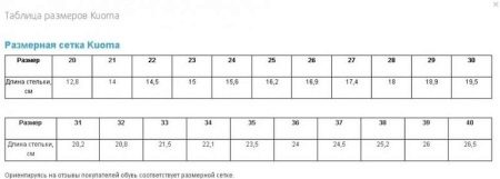 In accordance with the foot length, Kuoma felt boots for adults have a size range from 35 to 50 sizes. As for children's products, this is a range from 16.5 to 37.5. As you can see, this is somewhat different from the usual Russian size. Therefore, when choosing shoes should rely on the length of the foot, comparing it with the length of the insole. Those who neglect this condition run the risk of making a mistake in choosing the right size, especially if the shoes are ordered through an online store.