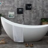 The bathtubs made of artificial stone have practically no differences in appearance from natural material. Using modern machining of artificial stone, manufacturers create unique designs of bathing bowls, exactly repeating the image of natural models. Most often, crushed marble, granite, malachite and quartz are used in production.