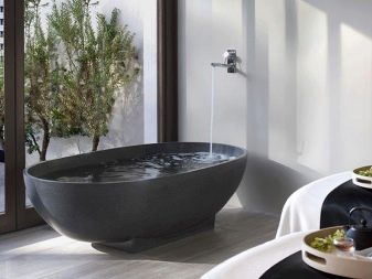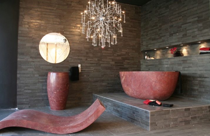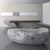 - Decorative highlight. Stone bathtubs look not just beautiful, but very impressive. They fit well into the interiors of bathrooms. It is advisable to complement the bathtub with a washbasin made of a similar material or countertop.