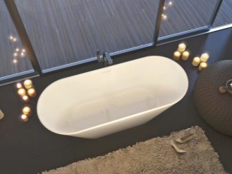 The range of oval bathing containers boasts not only a sleek design, but also soft forms. It is the oval baths that allow a person to relax after a hard day's work. The only inconvenience may seem to be the absence of armrests and seat recesses. Regarding dimensions, oval structures have a certain standard, namely 140x210 cm, but these are not the only specimens. Manufacturers of artificial stone bathtubs are ready to offer a wide variety of dimensions, and if necessary, even make to order.